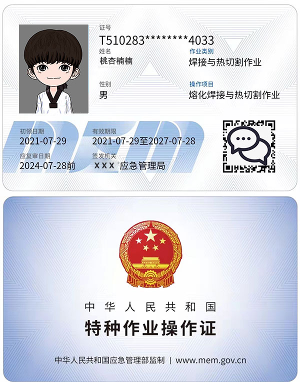 焊工證分為好幾種,上崗常用的屬于焊工特種作業操作證,是原安監局(現在的應急管理局)頒發的證件,證件全國通用、聯網可查,類似于身份證樣式的IC卡,有效期為6年,每3年需要復審一次,6年到期需要換證,復審和換證一般需要提前2-3個月申請,如果過期的話就視為作廢了,到時候就只能重新考!所以考了證的學員一定要記得提前復審和換證。